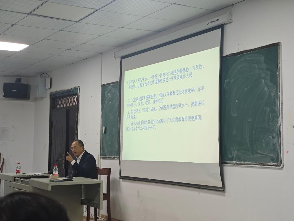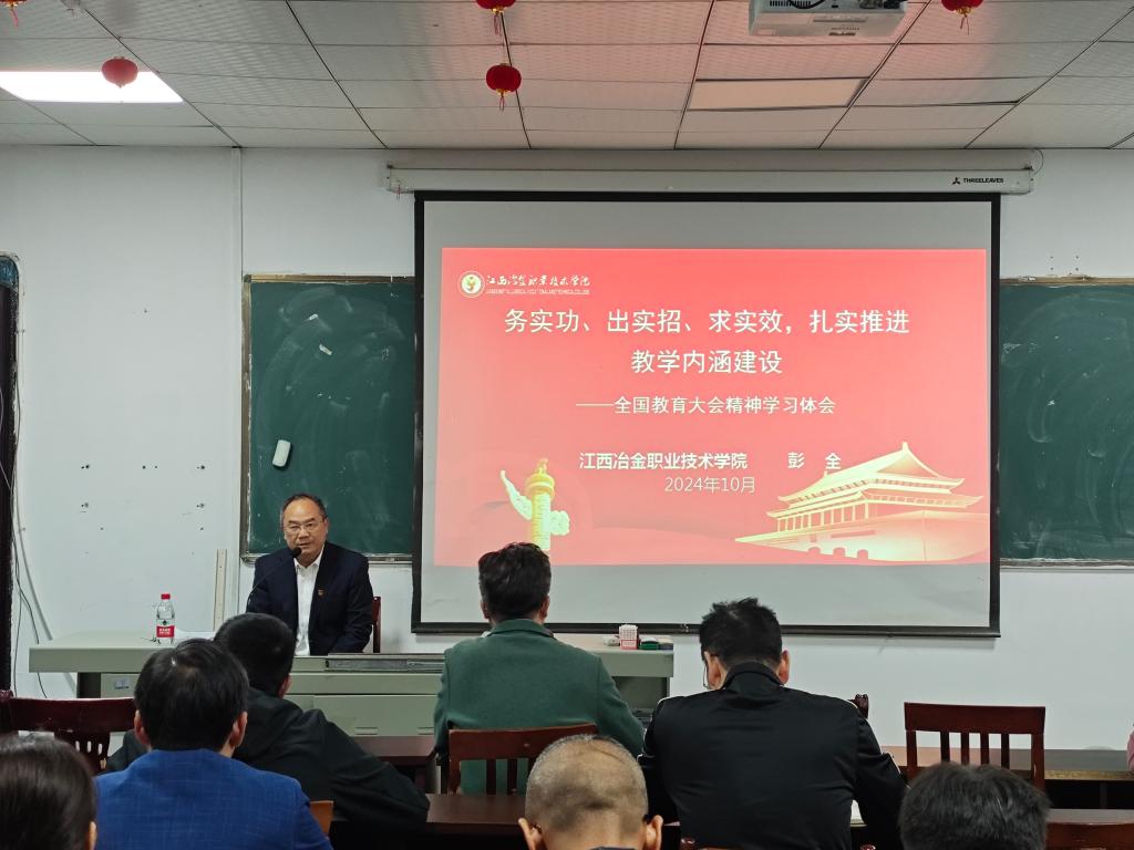 课上,彭全重点聚焦《全国教育大会精神》进行了领学解读并分享学习体会,对其中涉及的建设教育强国、统筹三大战略、提升教育的普惠性进行了细致解读,并联系职业教育内涵建设有关案例进行了分析。