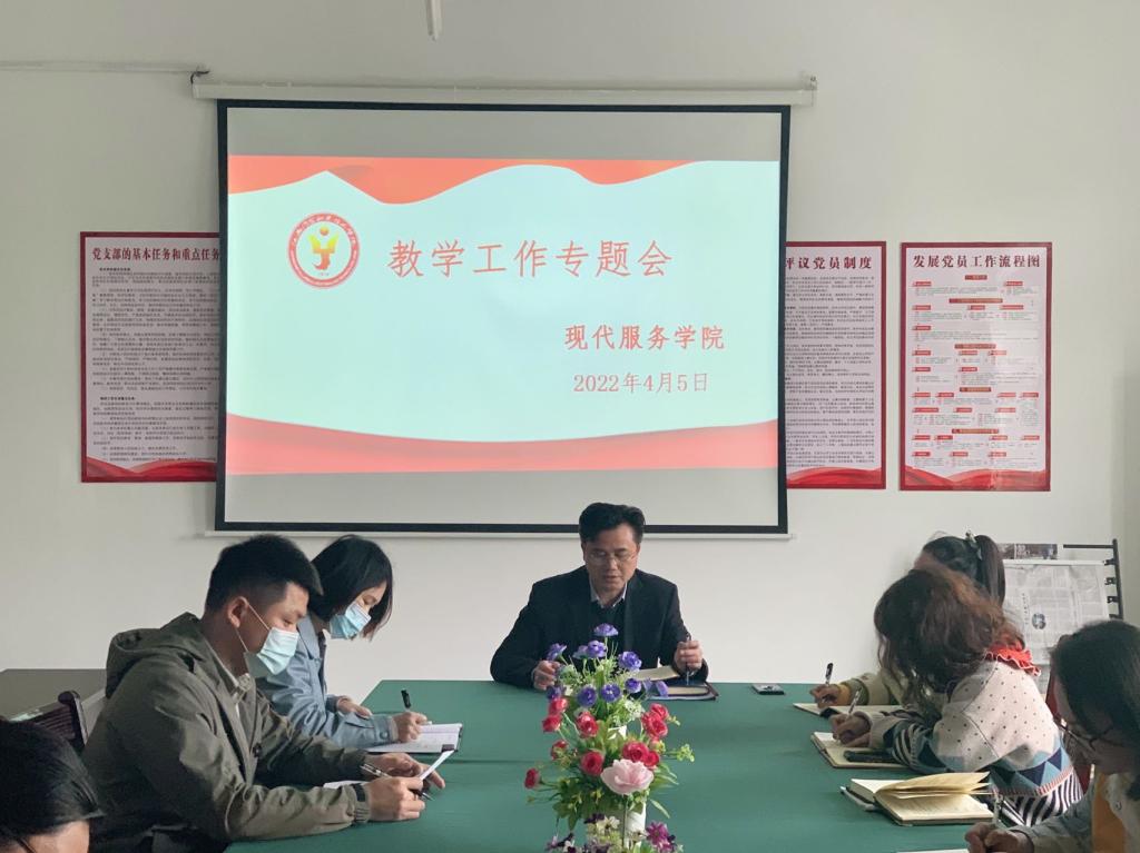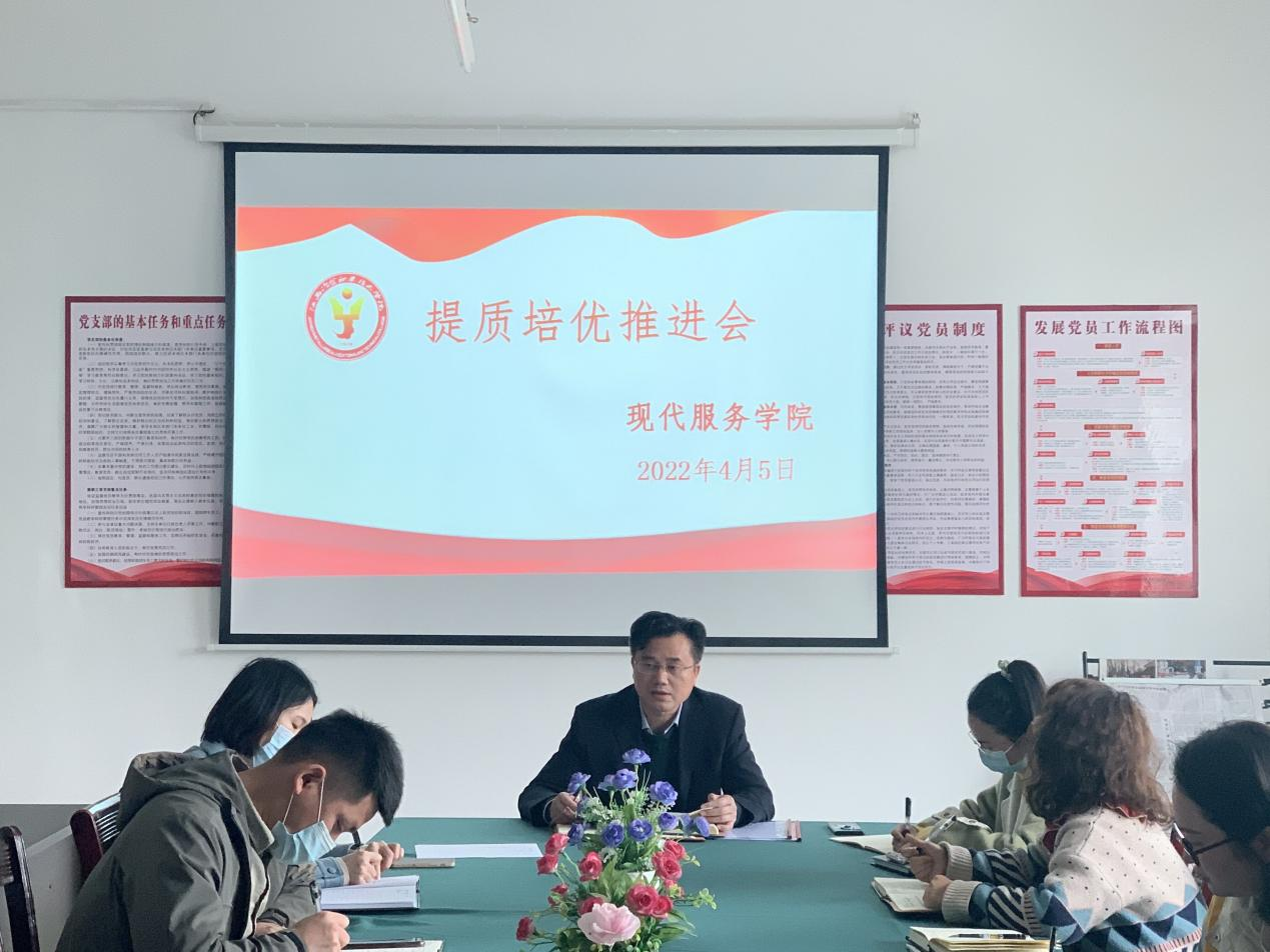 【现代服务学院肖倩芸报道】2022年4月5日中午,在老三教党员活动室,现代服务学院召开提质培优工作推进会。教学干事、各教研室主任参会,现代服务学院院长阮和平主持会议。会上,阮和平首先传达了3月31日学校提质培优工作例会的会议内容,并全面梳理了分院提质培优工作的承接项目、推进情况、存在问题和下一步推进计划。最后, 阮和平对提质培优工作提出三点要求:一是要充分认识提质培优工作的重要性,切实将承接的项目任务落...