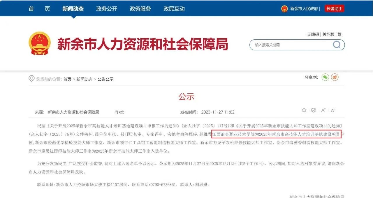 近日,经新余市人力资源和社会保障局组织评审并批准,学校获批“新余市高技能人才培训基地”。该基地的设立,标志着学校在服务地方产业发展、深化产教融合、培养高素质技术技能人才方面迈出了新的坚实步伐。学校作为一所以冶金、制造、电子信息、现代服务为特色的高职院校,长期坚持“立足地方、服务产业、强化技能、促进就业”的办学定位,拥有先进的实训设施、双师型教师队伍和成熟的技能培训体系,在智能制造、金属材料、电...