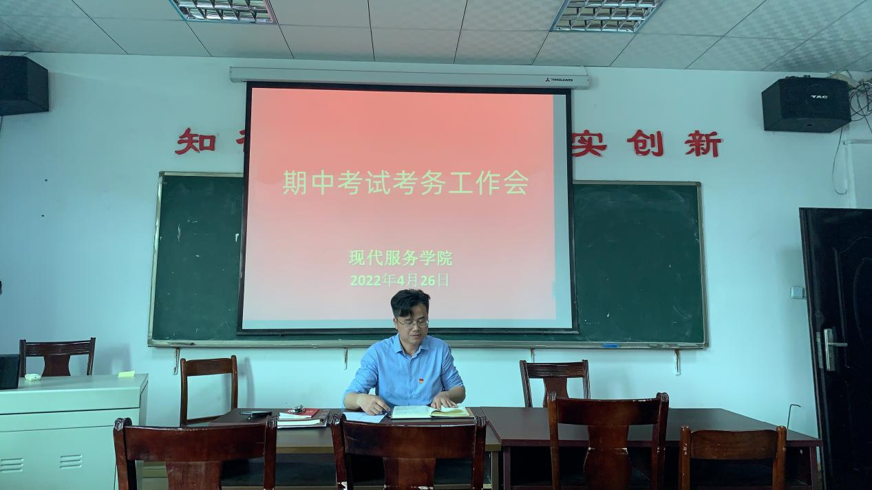 【现代服务学院周佳雪报道】 2022年4月26日下午,现代服务学院召开期中考试考务工作会。会议由分院院长阮和平主持。考务会上,阮和平指出,期中考试是对学生阶段性学习质量的重要诊断手段,是评价老师开展教学成效的客观依据,大家必须高度重视、认真对待。他还就考场布置、监考人员职责、考后改卷统分、学情分析等工作作了详尽安排。最后,阮和平对此次期中考试工作提了三点工作要求:一要严格考试流程;二要严明考场纪律;三...