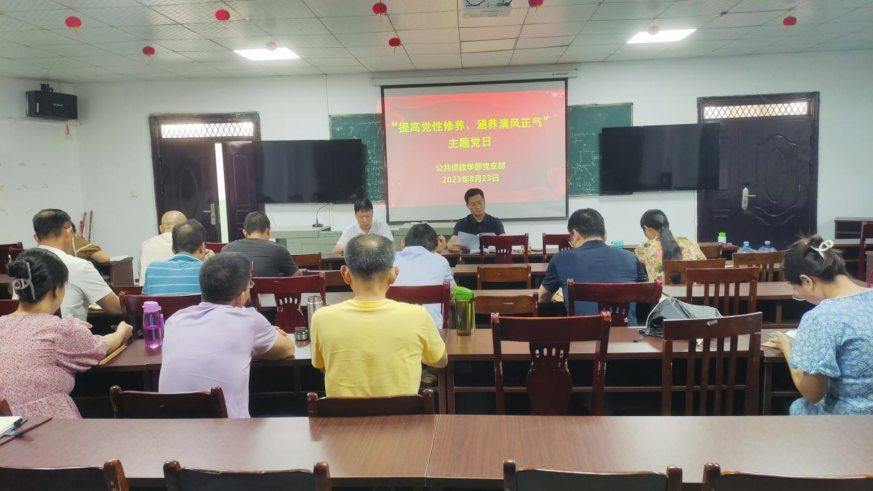 【公共课教学部党支部雷小花报道】8月23日下午,公共课教学部党支部在明辨楼312室开展“提高党性修养,涵养清风正气”主题党日活动。活动由党支部书记邓灵波主持,支部全体党员参加学习。活动伊始,党支部为本月过政治生日的戴宝富﹑邱伟东两位党员送上生日祝福,两位党员分别发表了自己的生日感言。全体党员一起重温入党誓词,感受入党初心及使命。紧接着,邓灵波带领大家深入学习《关于在主题教育中深入学习领会习近平总书记...
