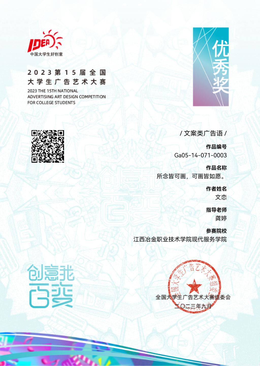 12-06/2023喜报!我校学生获第15届全国大学生广告艺术大赛优秀奖