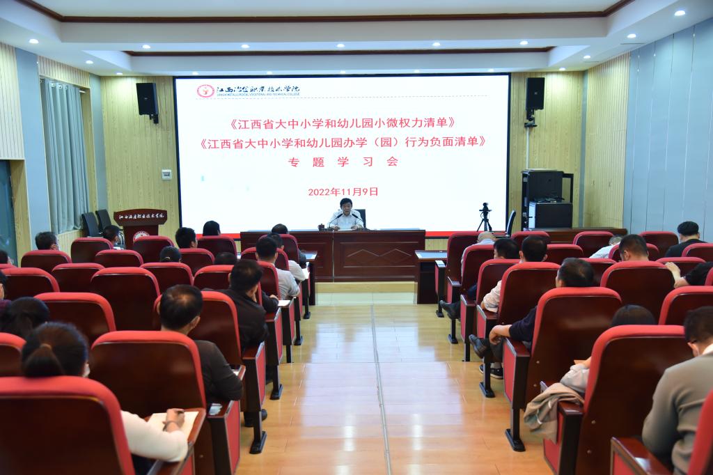 11月9日,学院纪委组织全体中层干部在思政大讲堂召开《江西省大中小学和幼儿园小微权力清单》《江西省大中小学和幼儿园办学(园)行为负面清单》专题学习会。会上,学院党委委员、纪委书记谢向莹结合学院规章制度和典型警示案例,从深刻认识“两个清单”的重要意义、准确把握“两个清单”的内容要求、从严抓好“两个清单”的贯彻落实三个方面,带领全体中层干部深入学习领会“两个清单”内容要求。会议要求,要提高政治站位,努...