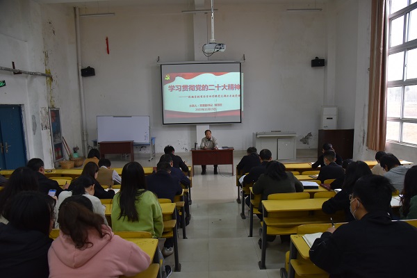 2022年11月15日下午,在南校区三教阶梯教室,学院党委副书记李茂旺上了一堂学习宣传贯彻党的二十大精神专题党课。机关一党支部、商务管理学院党支部、后勤党支部的党员、入党积极分子共计80余人参加了党课学习。李茂旺从介绍党的二十大的盛况、学习领会党的二十大精神等内容进行授课,分享了学习体会。他在讲到“关于教育、科技、人才的论述”的内容时指出,学习宣传贯彻好党的二十大精神,要在实干上下功夫。他勉励广大教师,...