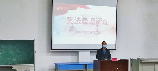 今年12月4日是第九个国家宪法日,也是我国现行宪法公布施行四十周年。为深入学习贯彻党的二十大精神,弘扬宪法精神,维护宪法权威,商务管理学院积极开展2022年“12.4”国家宪法日系列活动。12月2日,分院组织学生代表开展“宪法晨读”活动。由团总支书记黄萍领读宪法部分条款,晨读活动现场,全体学生精神饱满,认真聆听宪法条款并认真进行跟读。晨读结束后,分院党支部副书记唐毓林给大家提出了三点希望,即认真学习宪法知识...