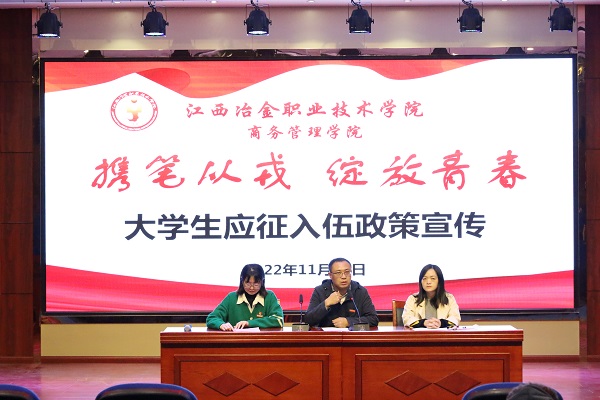 2022年11月27日,在学术报告厅,商务管理学院举行了以“携笔从戎、绽放青春”为主题的征兵工作启动仪式。分院副院长郭斌、江小美老师、2023届毕业班全体辅导员以及部分毕业班学生共计200余人参加了会议。院长助理陈利华主持会议。在仪式上,毕业班级辅导员进行了“征兵入伍宣传”主题班会说课比赛。各辅导员利用播放《参军报国 不负韶华》和《逐梦青春》征兵宣传视频等多种形式,宣传大学生应征入伍的重要意义,取得了良好的效...