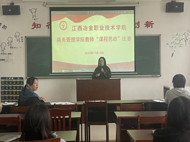 2022年11月18日下午,商务管理学院课程思政教学竞赛在南校区三教201教室举行。比赛由江小美老师主持,分院教务科长和各教研室主任担任评委。 本次比赛分为教学设计和现场展示两个部分。整场比赛紧张有序,精彩纷呈。参赛教师们精神饱满、备课充分,注重将价值塑造、知识传授和能力培养有机贯通,深入挖掘课程蕴含的思想政治教育元素和所承载的思想政治教育功能,使各类课程与思想政治理论课程同向而行,实现“知识传授”和“价...